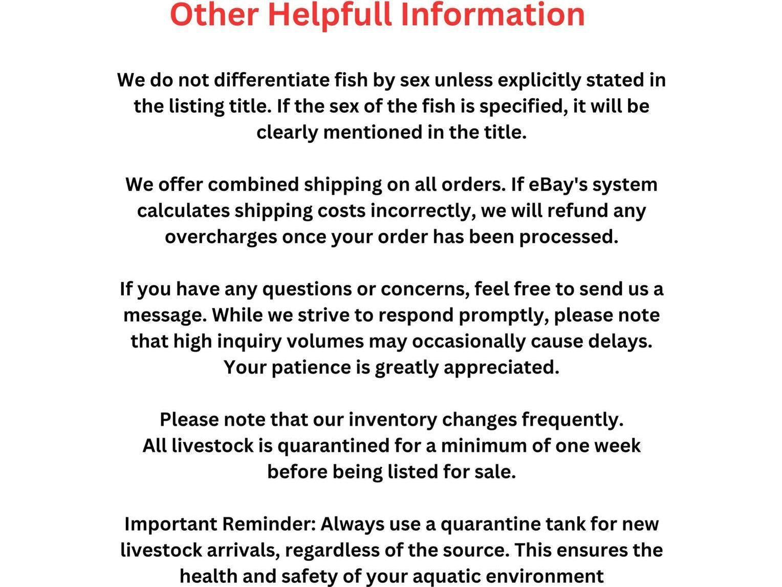 As with all live animal sales, there is a risk that they may arrive dead (DOA). If this is the case then a picture of the dead fish WITHIN THEIR ORIGINAL UN-OPEN BAG must be sent to us SAME DAY AS RECEIVED. By purchasing this item you are agreeing to follow this process for any DOA claims.