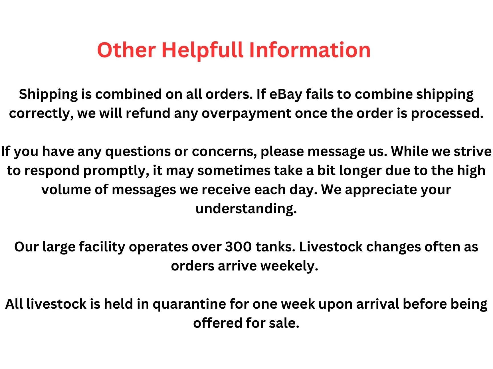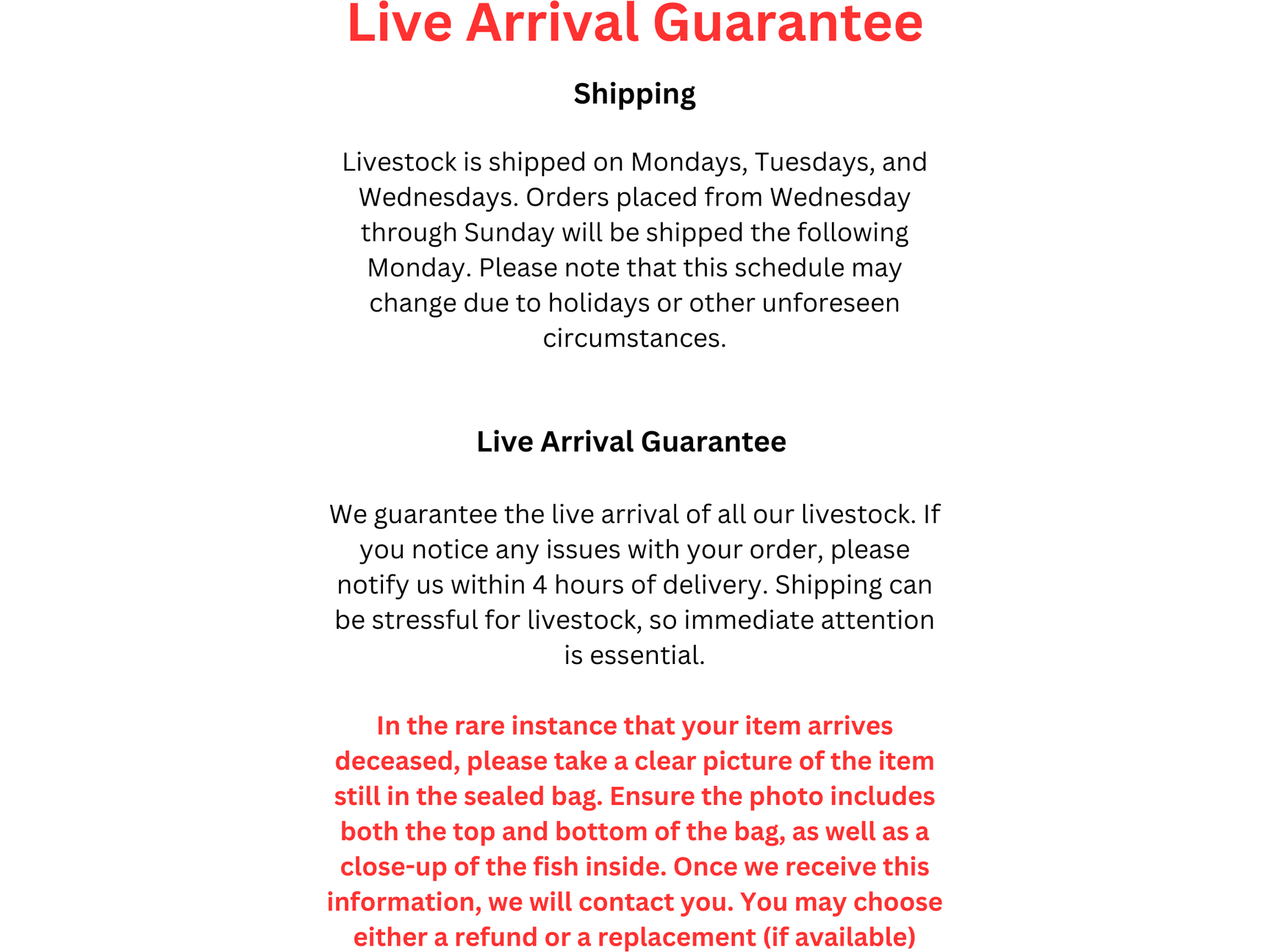 As with all live animal sales, there is a risk that they may arrive dead (DOA). If this is the case then a picture of the dead fish WITHIN THEIR ORIGINAL UN-OPEN BAG must be sent to us SAME DAY AS RECEIVED. By purchasing this item you are agreeing to follow this process for any DOA claims.