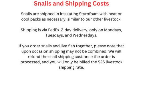 Live aquatic life is exclusively shipped on Monday, Tuesday, Wednesday and Saturday. This schedule might change due to holidays or other unforeseen circumstances. Please understand once the post office has your package we have no control over transit times. If items arrive deceased please follow simple process below for our guarantee. We can ship overnight if that is desired.