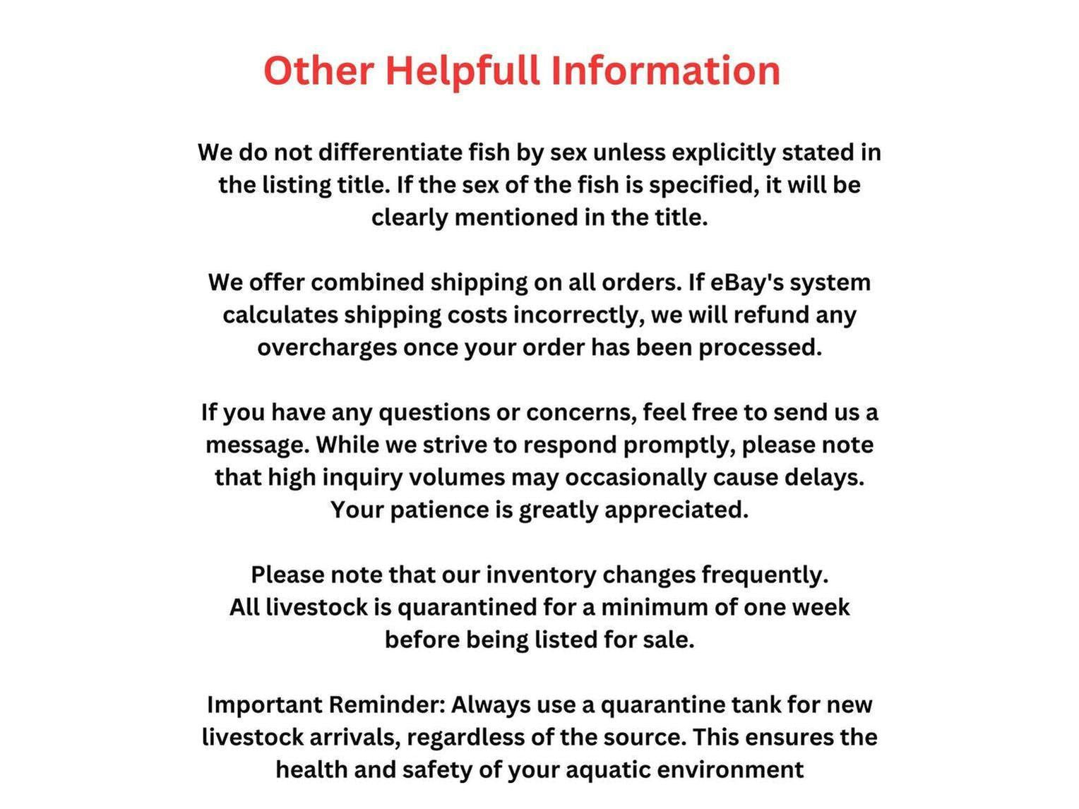 As with all live animal sales, there is a risk that they may arrive dead (DOA). If this is the case then a picture of the dead fish WITHIN THEIR ORIGINAL UN-OPEN BAG must be sent to us SAME DAY AS RECEIVED. By purchasing this item you are agreeing to follow this process for any DOA claims.