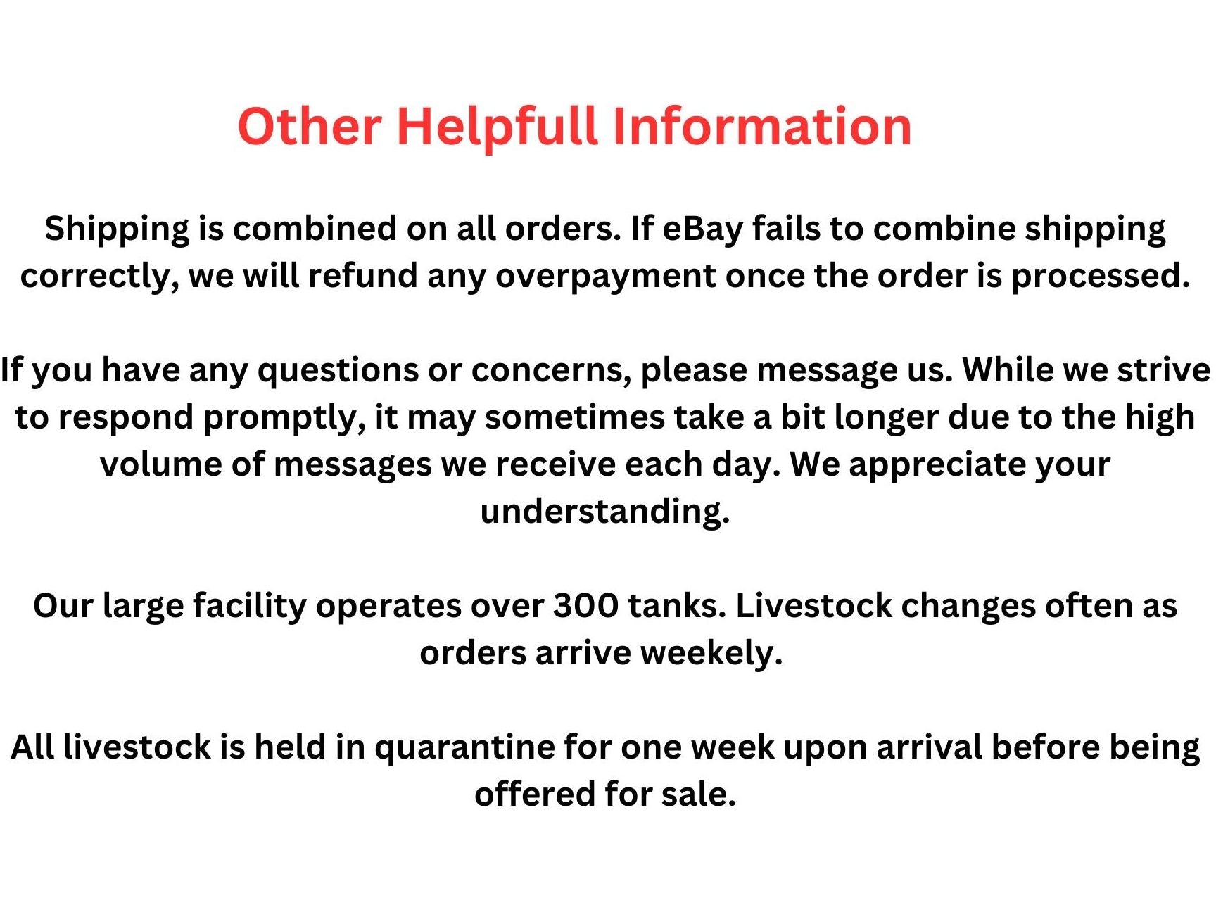 In the rare instance that your item arrives deceased, please take a clear picture of the item still in the sealed bag. Ensure the photo includes both the top and bottom of the bag, as well as a close-up of the fish inside. Once we receive this information, we will contact you. You may choose either a refund or a replacement (if available)