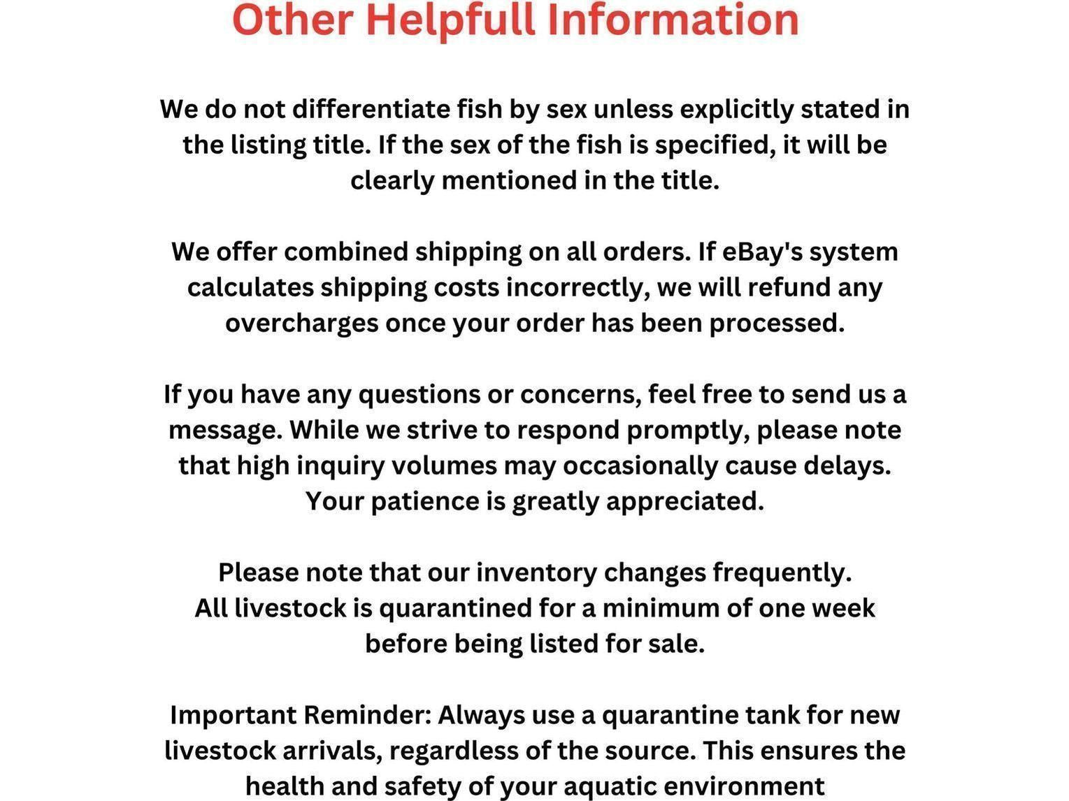 As with all live animal sales, there is a risk that they may arrive dead (DOA). If this is the case then a picture of the dead fish WITHIN THEIR ORIGINAL UN-OPEN BAG must be sent to us SAME DAY AS RECEIVED. By purchasing this item you are agreeing to follow this process for any DOA claims.