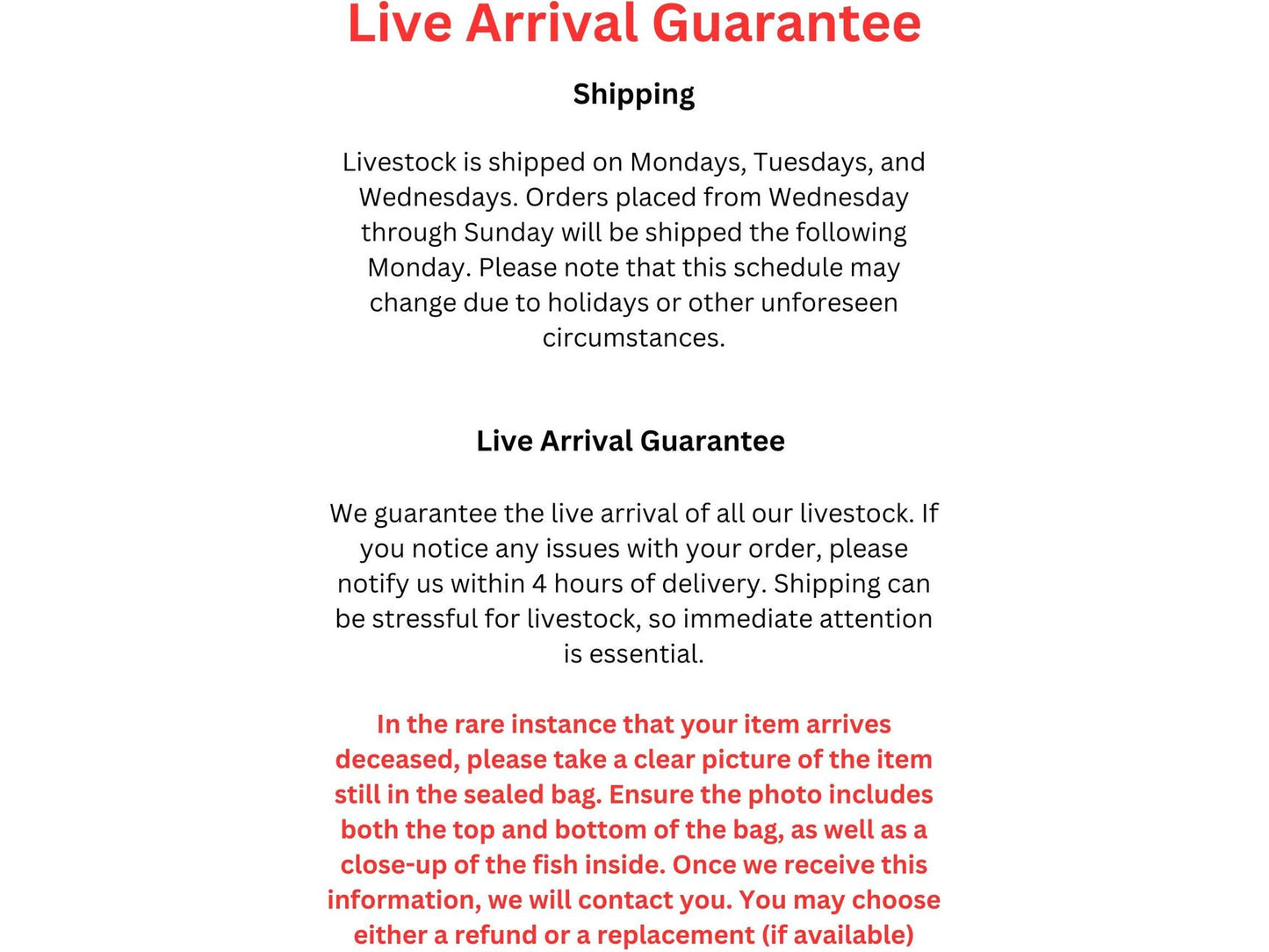 In the rare instance that your item arrives deceased, please take a clear picture of the item still in the sealed bag. Ensure the photo includes both the top and bottom of the bag, as well as a close-up of the fish inside. Once we receive this information, we will contact you. You may choose either a refund or a replacement (if available)