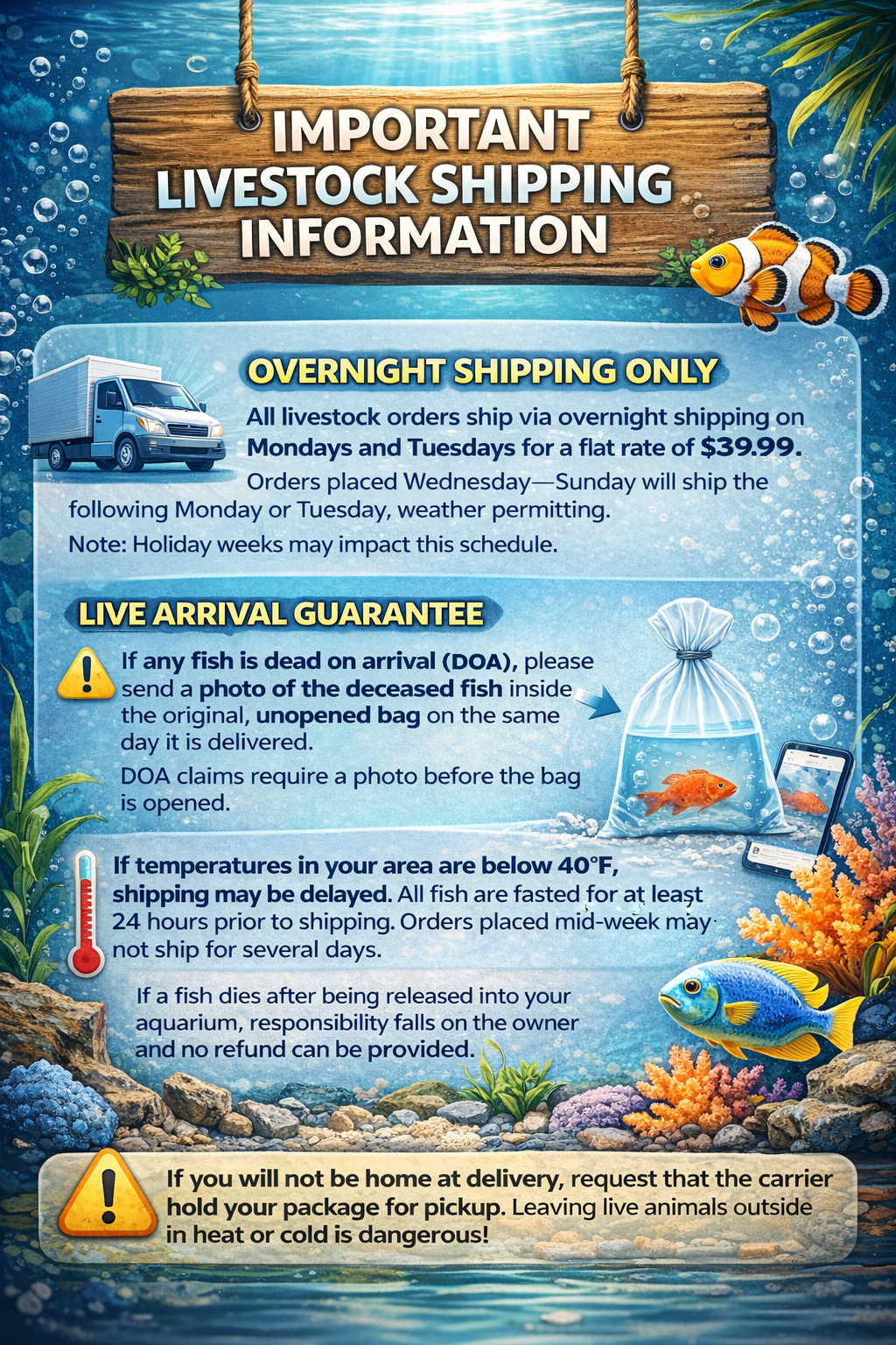 Aquatic life is shipped exclusively on Mondays, Tuesday, Wednesdays, and Saturdays. Items may be sent via USPS Priority Mail, FedEx, or UPS, as determined by us. Note that fish are not fed for 24 hours before shipping. Additionally, weather conditions are checked to ensure that shipments are in transit during the most favorable weather temperatures possible.