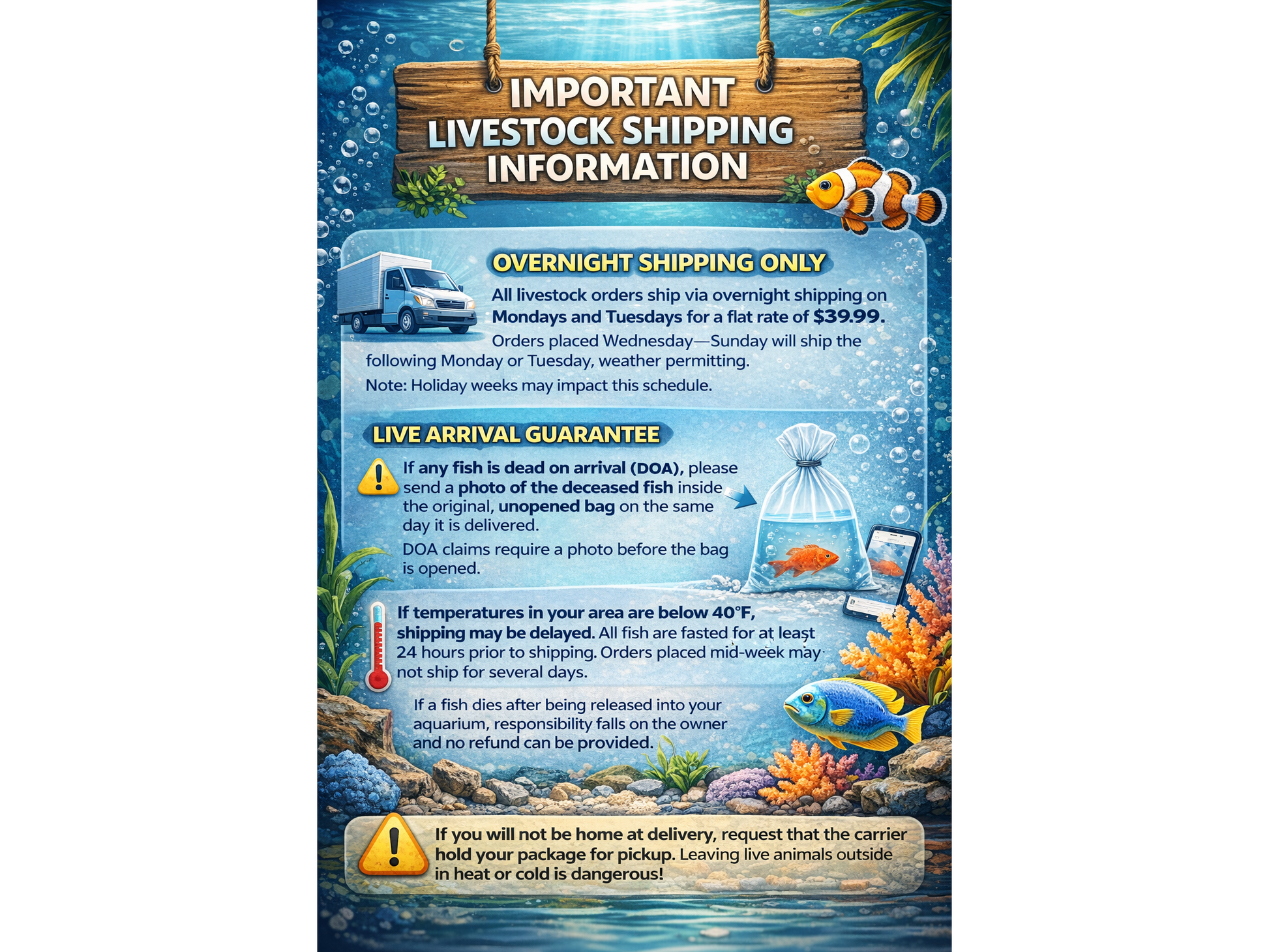 If you will not be available at the time of delivery, we strongly recommend requesting that the carrier hold the package for pickup at their facility. Exposure to extreme heat or cold can be harmful to live aquatic animals.