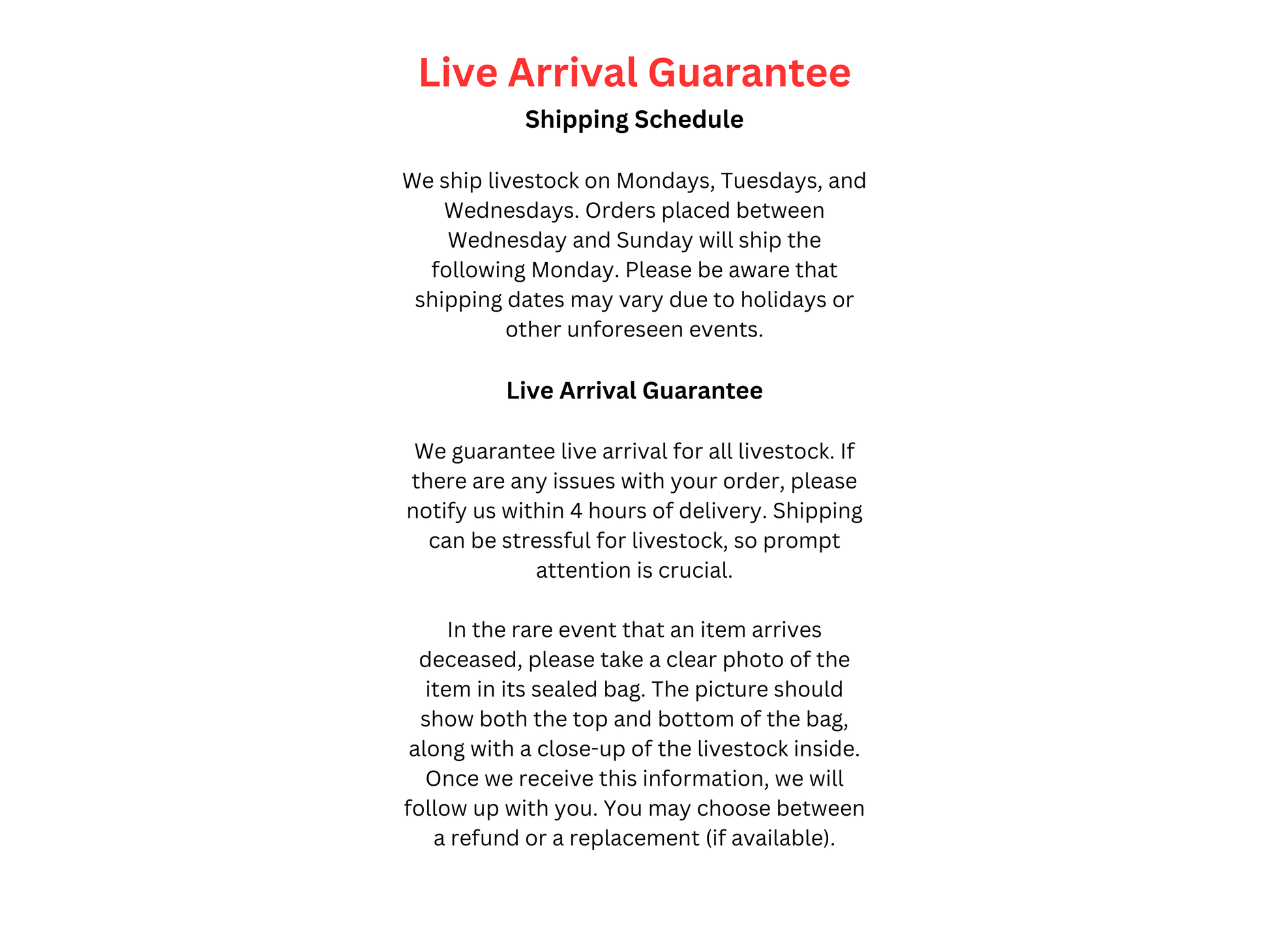 Live aquatic life is exclusively shipped on Monday, Tuesday, Wednesday. This schedule might change due to holidays or other unforeseen circumstances. Please understand once the post office has your package we have no control over transit times. If items arrive deceased please follow simple process below for our guarantee. We can ship overnight if that is desired.