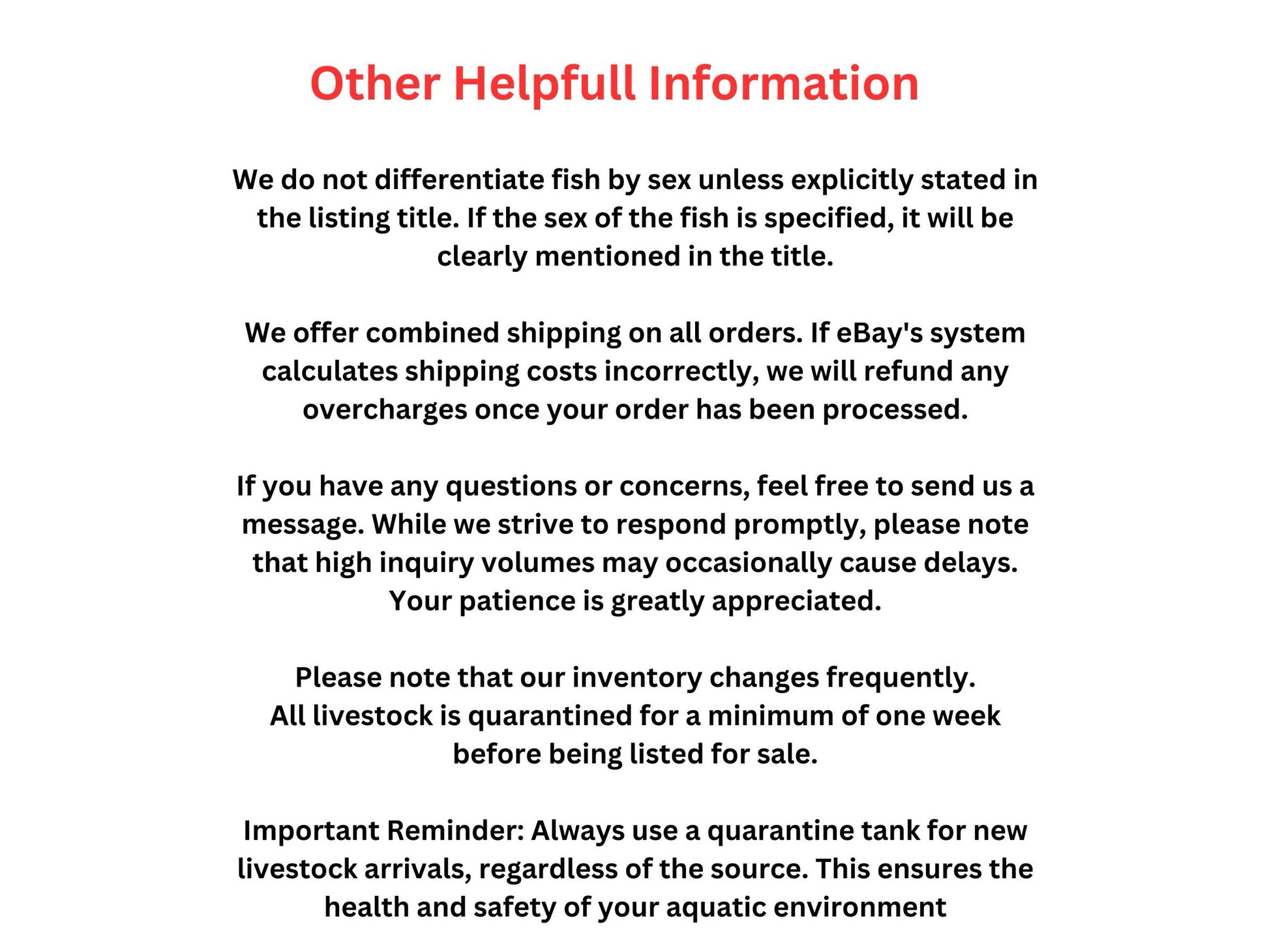 To maintain the highest quality, all fish undergo a one-week quarantine upon arriving at our warehouse before being made available for sale. This practice helps ensure the health and well-being of the fish we offer to our customers.